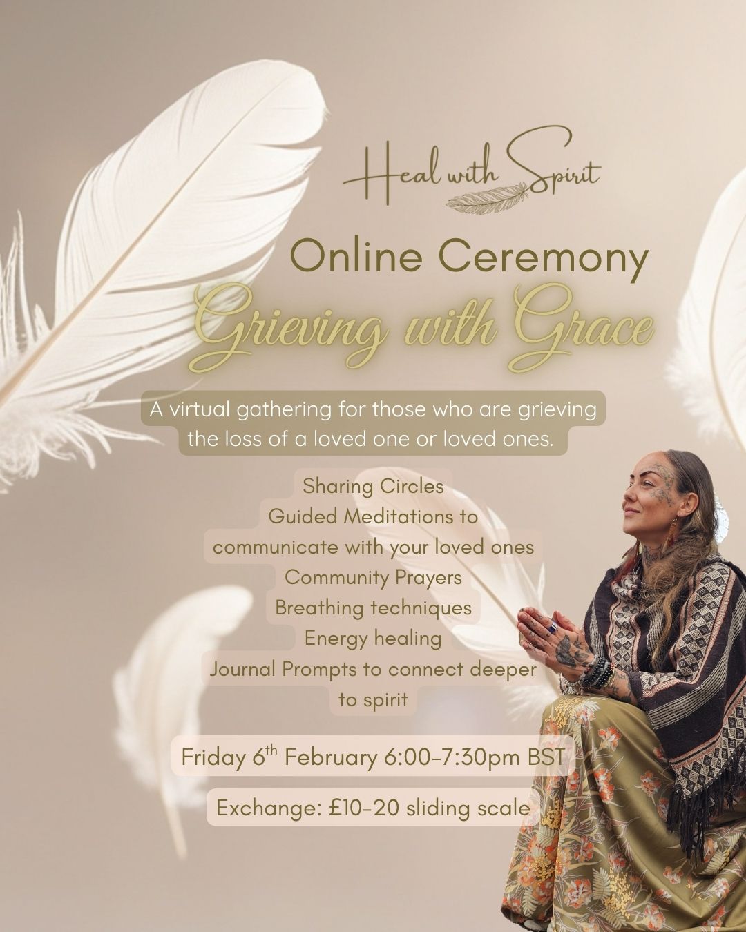 Welcome to a space where your grief is totally welcomed with gentleness and warmth. How do we grieve gracefully? By giving 0ourselves permission to feel it all, to be both messy and composed, to allow both the ugly and the good, and to love ourselves more and more for feeling the full expression of life and grief. We will all experience the loss of a loved one, and we will all die. Yet there is much work to be done so we stop shying away from our pain and instead approach it with love, kindness, and curiosity. For grief has gifts for us if we explore deep enough. And within cereonial spaces you can often find the frequemcy you need to come inwards, feel with safety, and find a deeper, stronger connection to those you love in spirit. This isn't a one time healing session, this is an invitation to extract what you align with in the gathering, and to apply it to your own journey. Because this journey is non linear. This journey goes in all directions, so when you strengthen your connection to yourself and spirit, you're better equipped to deal with the tougher times with more compassion and awareness. This ceremony is all about bringing in that guiding light your loved ones in spirit so often offer you. Removing blocks that keep you feeling connecting to them. Sharing experiences with kindred spirits who walk their own path with grief but seek community and care. This is a portal into the growth, ascension, intelligence and remembrance of who you are. Please bring a candle, a photo of your loved one(s) and any other sacred items you would like to bring to the space you choose to be in. Please ensure you have minimal distractions and keep yourself on mute when others are sharing. Sharing will be invited but totally optional.